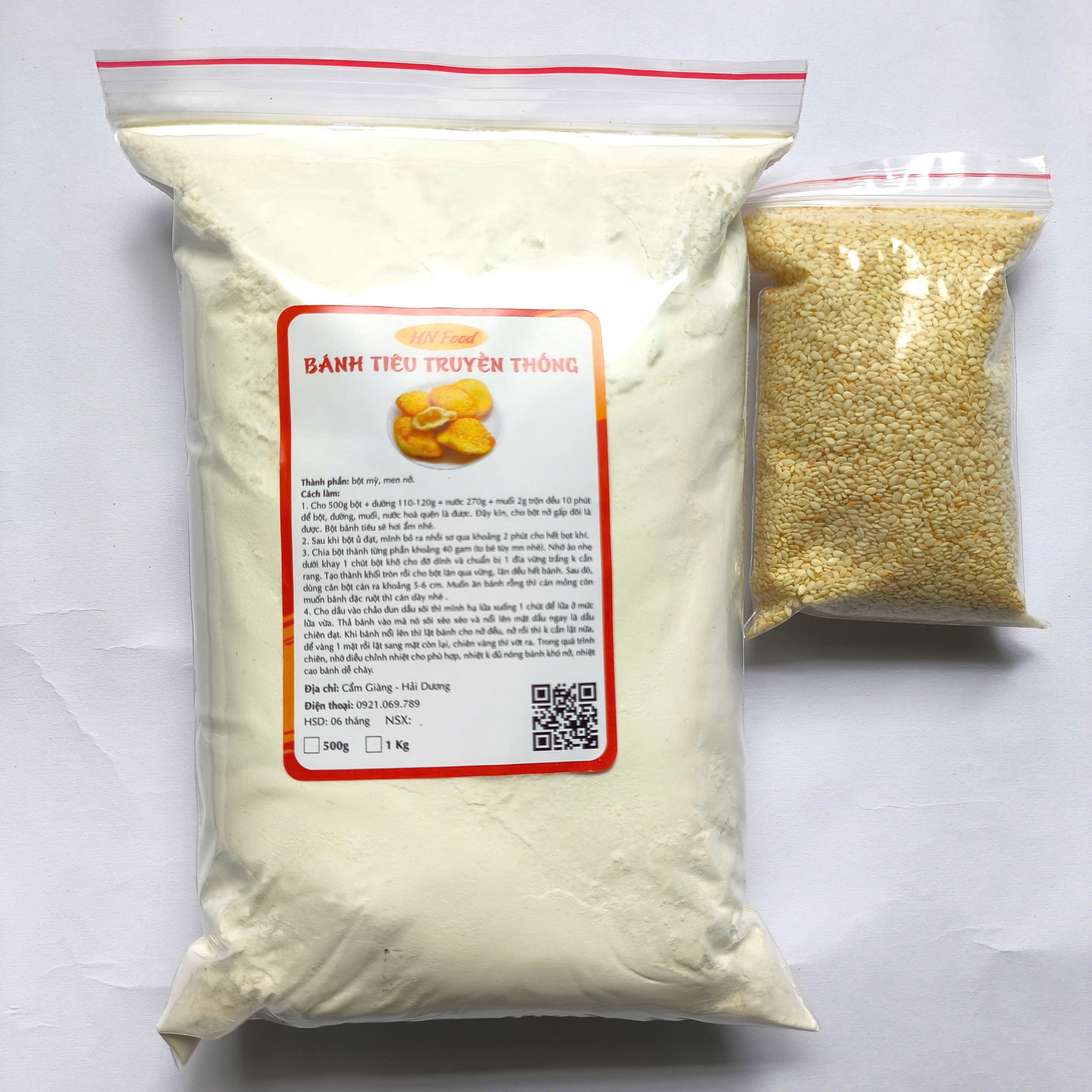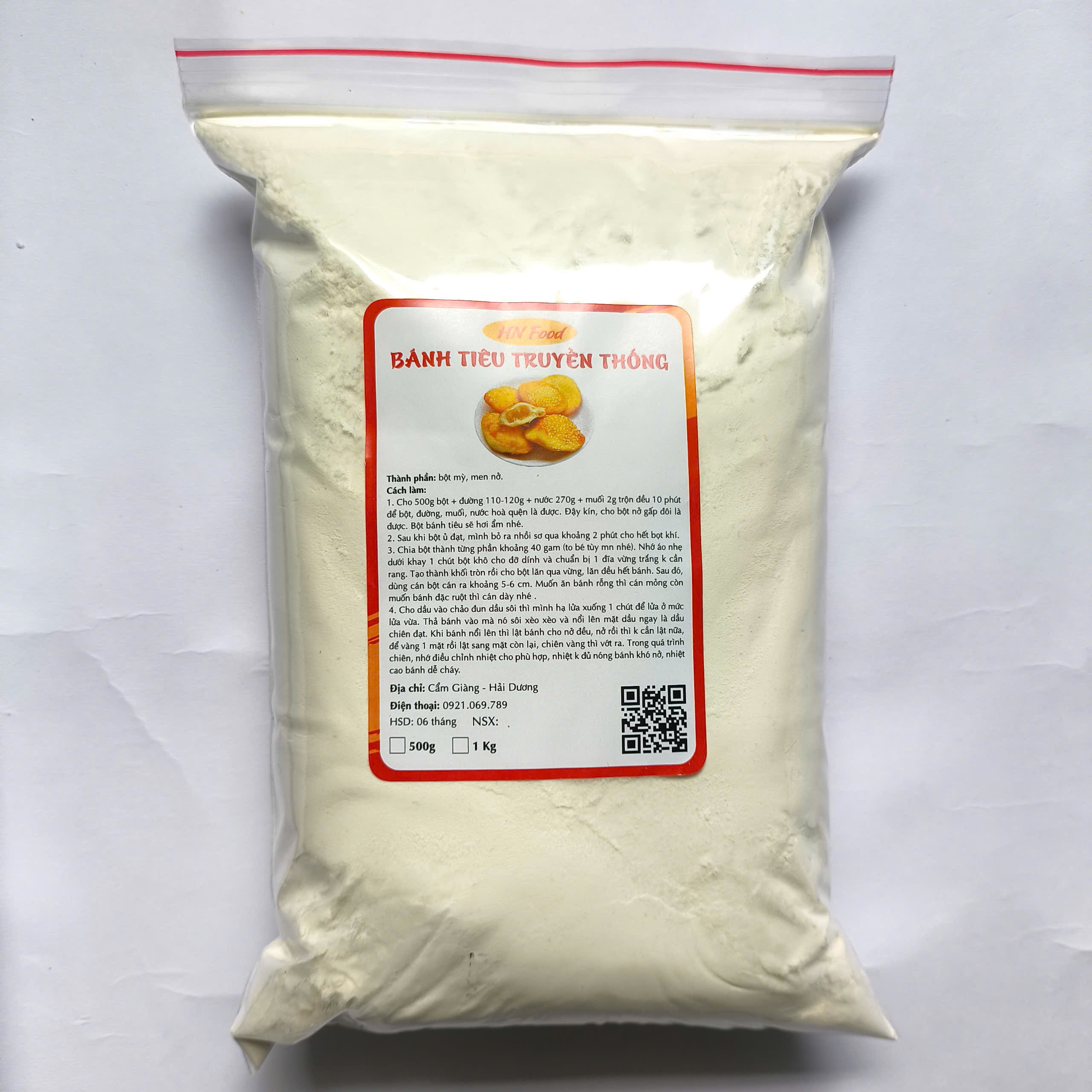 Bột làm bánh Tiêu truyền thống Bánh tiêu là một món ăn quen thuộc gắn liền với tuổi thơ của nhiều người. Những chiếc bánh phồng xốp, vàng ruộm, thơm phức mùi mè luôn khiến chúng ta khó cưỡng lại. Khi chế biến, người ta thường thêm một chút đường để tạo vị ngọt nhẹ cho bột, giúp bánh có hương vị hài hòa hơn.
