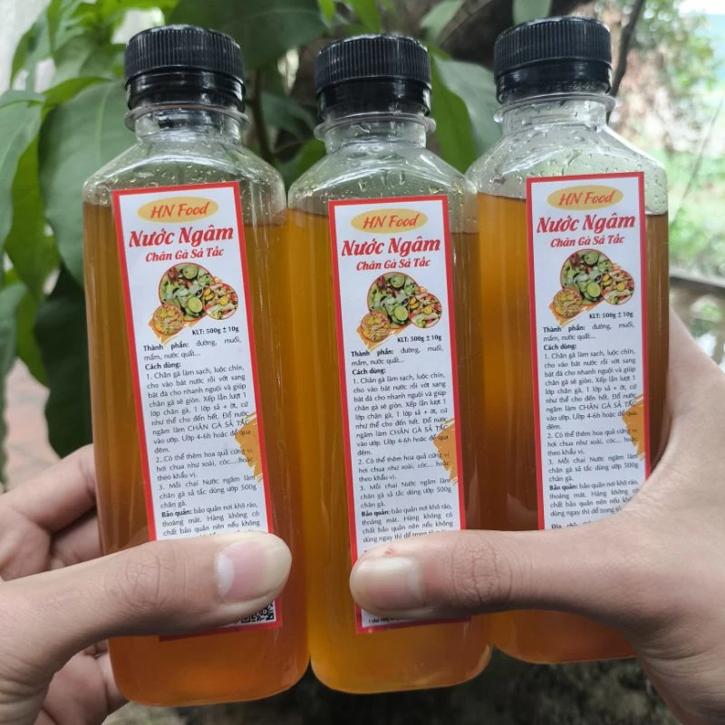Nước ngâm làm CHÂN GÀ SẢ TẮC ăn liền Nước ngâm làm CHÂN GÀ SẢ TẮC ăn liền mỗi chai dùng ngâm 500g chân gà 1. Chân gà làm sạch, luộc chín, cho vào bát nước rồi vớt sang bát đá cho nhanh nguội và giúp chân gà giòn hơn. Xếp lần lượt 1 lớp chân gà, 1 lớp sả + ớt, cứ như thế cho đến hết. Đổ nước ngâm làm CHÂN GÀ SẢ TẮC vào ướ. Ướp 4-6h hoặc để qua đêm. 2. Có thể thêm hoa quả cứng, vị chua như xoài, cóc…hoặc theo khẩu vị. 3. Mỗi chai Nước ngâm làm CHÂN GÀ SẢ TẮC dùng ướp 500g chân gà. Bảo quản: bảo quản nơi khô ráo, thoáng mát. Hàng k sử dụng chất bảo quản nên nếu k dùng ngay thì để trong tủ mát. HSD: 6 tháng trong tủ mát